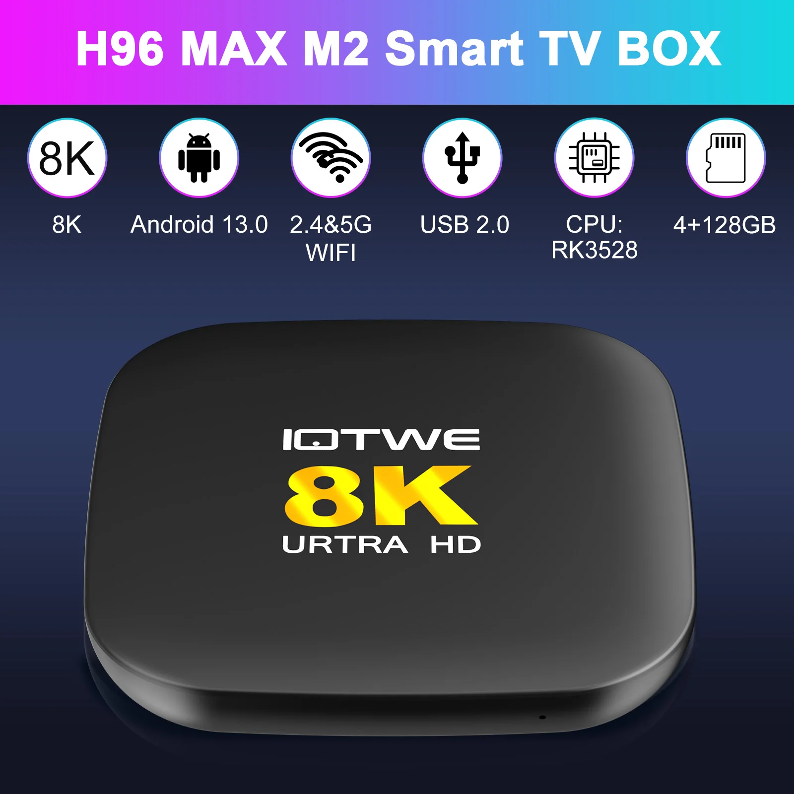 The H96 Max M2 TV Box, powered by the advanced Rockchip RK3528 processor, offers exceptional performance and energy efficiency, ensuring smooth operation and reduced power consumption. Its integrated C PU delivers stunning visuals, perfect for high-definition and 4K content. With built-in Al capabilities, the device supports advanced functionalities like voice recognition and image processing. The RK3528 also supports the latest connectivity standards for fast, stable connections and is compatible with Android 13.0, keeping your device up-to-date with the newest features and updates. Elevate your entertainment experience with the H96 Max M2.