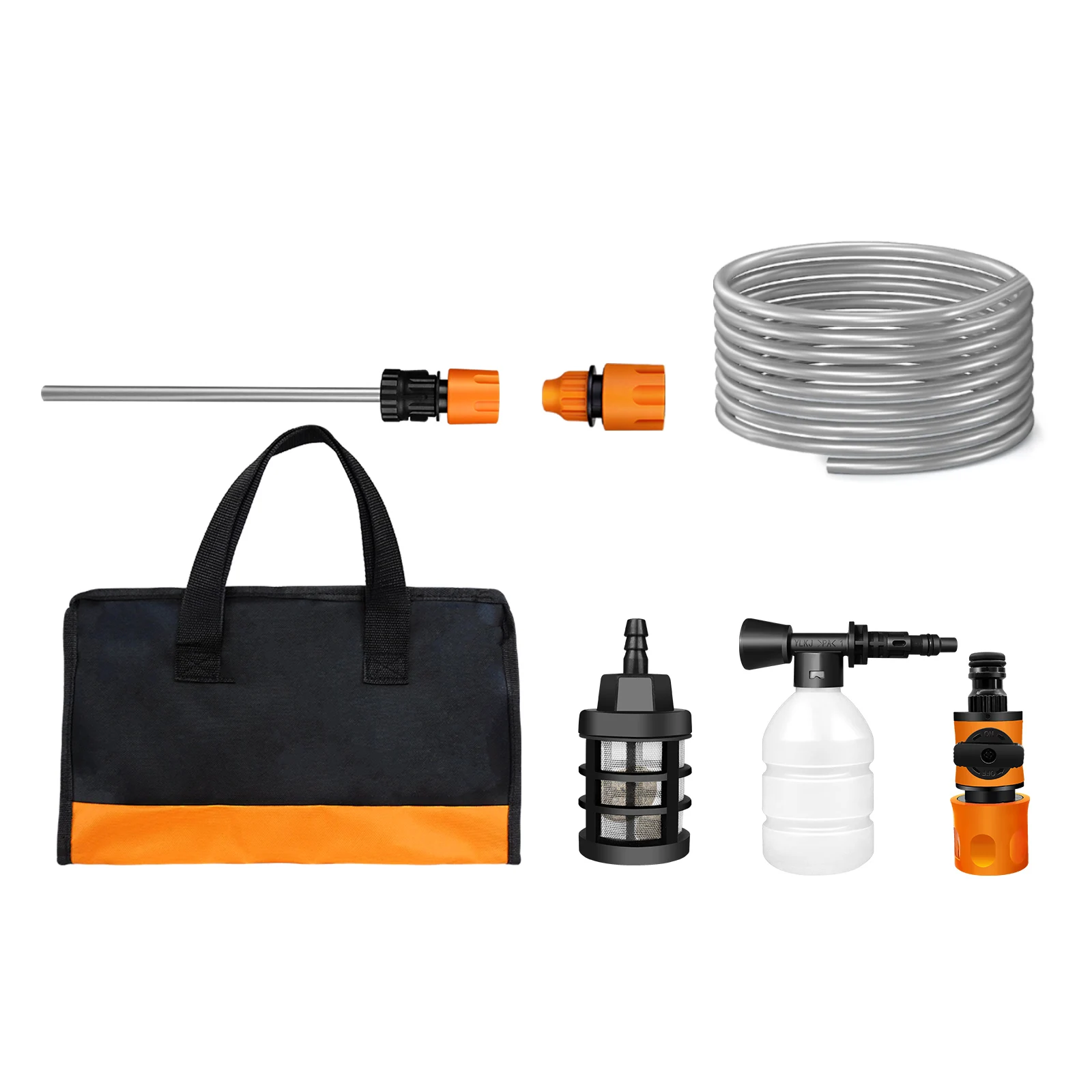 Our cordless pressure washer with 5M hose. The hose with filter basket can effectively filter the waste leaves, sludge and impurities, etc. Can better protect our pressure machine. With another short hose can connect with the bottle or cans. you can get the water resource easily from any tanks.