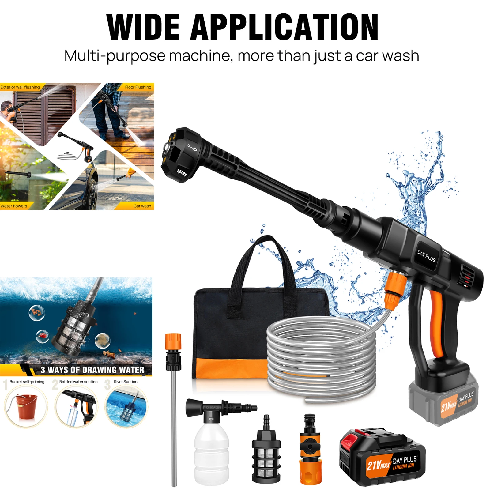 Our cordless pressure washer with 232PSI working pressure and a flow rate of 270L/H. This high-pressure portable power washer is powerful enough and meet your needs for washing cars, cleaning and maintenance of all kinds of motor vehicles, engineering vehicles, engineering machinery and agricultural machinery supporting products,watering flowers and cleaning floors in minutes.