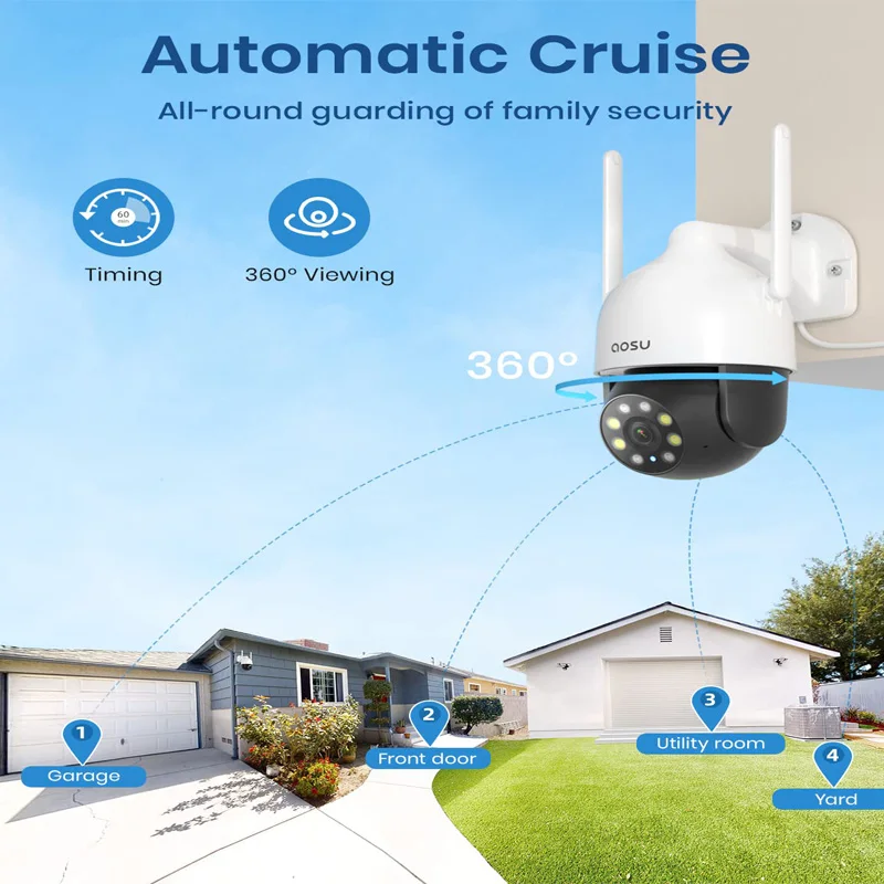 Protect Every Angle, Effortlessly: AOSU security camera's 360° rotation, timed cruise, and spot cruise functions ensure comprehensive coverage, leaving no blind spots in your home's security.
