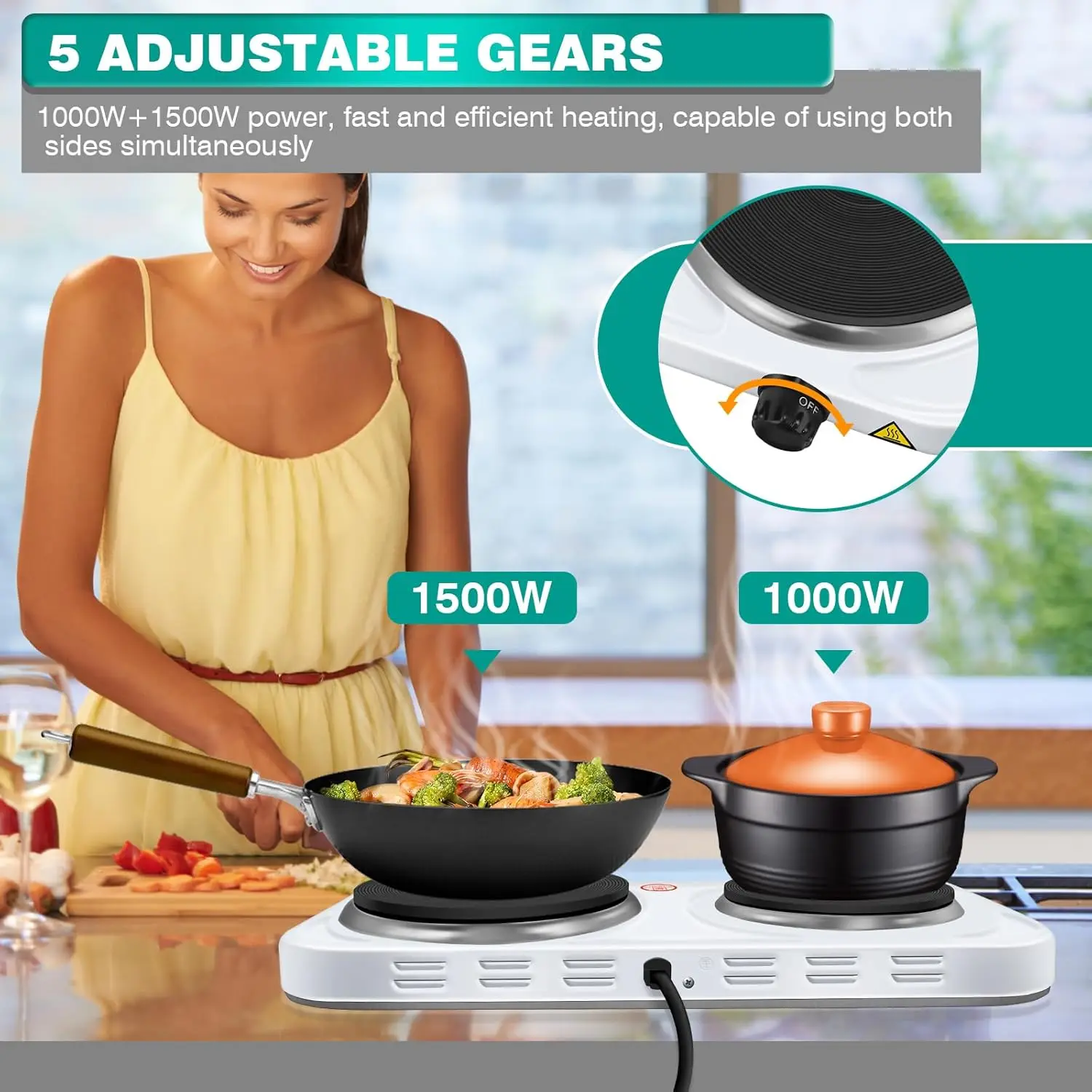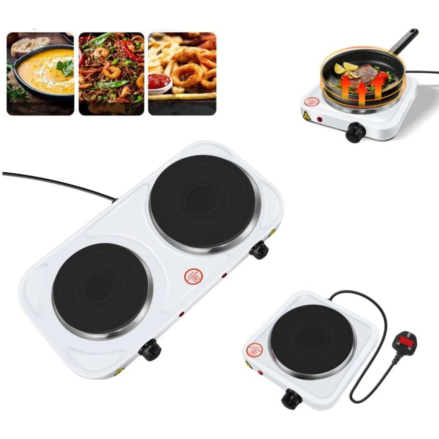 🍳QUICK HEATUP & ADJUSTABLE TEMPERATURES – This double hotplate with temperature controls will heat up to your desired temperature in just minutes. Primary hot plate– 1500W, Secondary hot plate 1000 W. The lower heat settings are perfect for simmering or warming food. The high settings are for boiling or frying. Boasting 5 temperature settings ranging between 150°C-550°C.