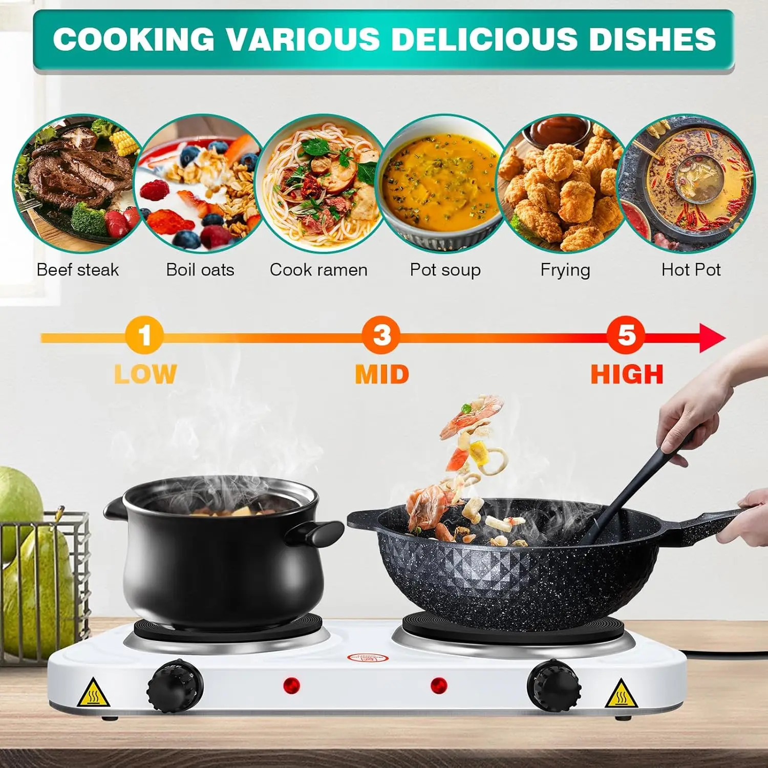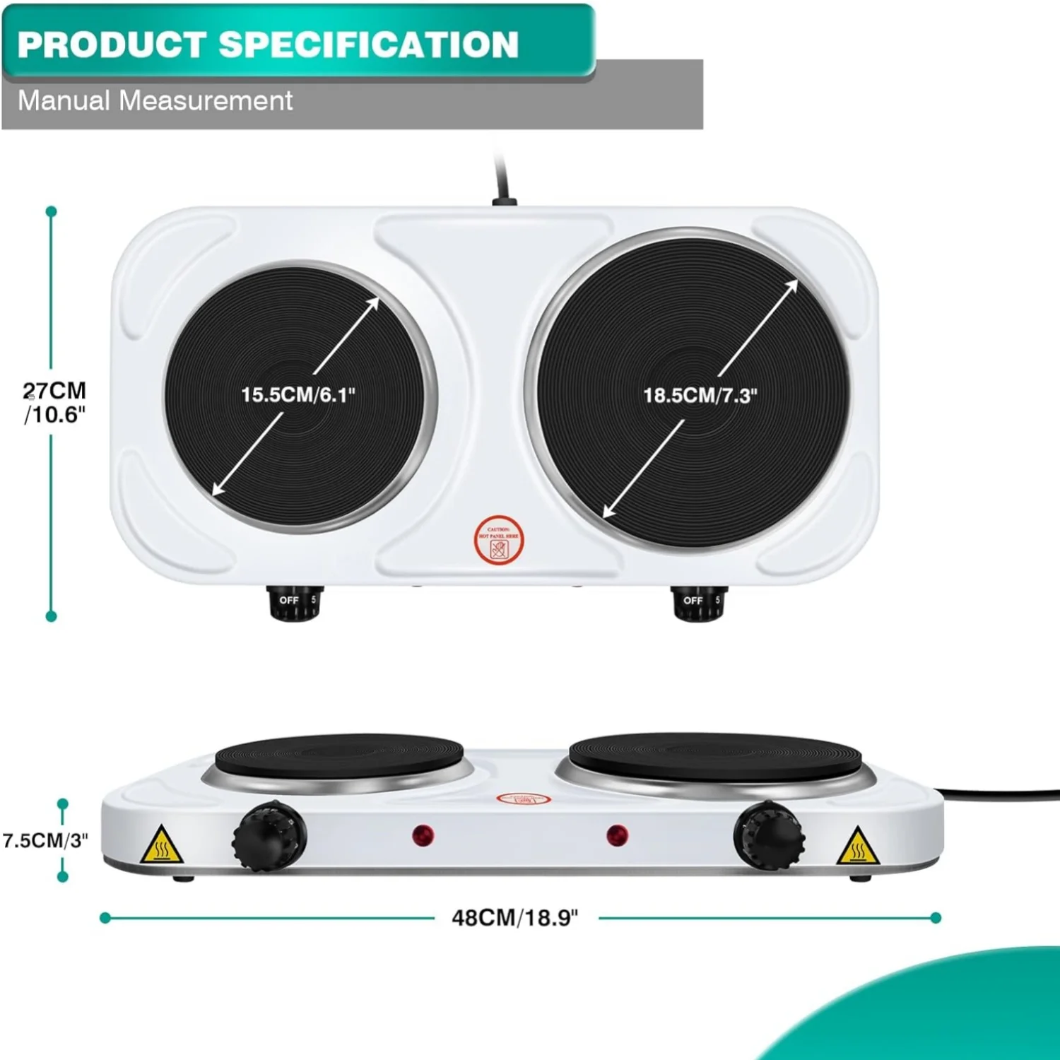 🍳CONVENIENT & INDEPENDABLE COOKING – Cook two dishes at the same time as the large hot plate measures 7” inch and the small hot plate is 6”. The burner plates are spaced far enough apart to cook with two pots at the same time. The NON-SLIP FEET on the electric countertop burner ensure total stability while cooking.