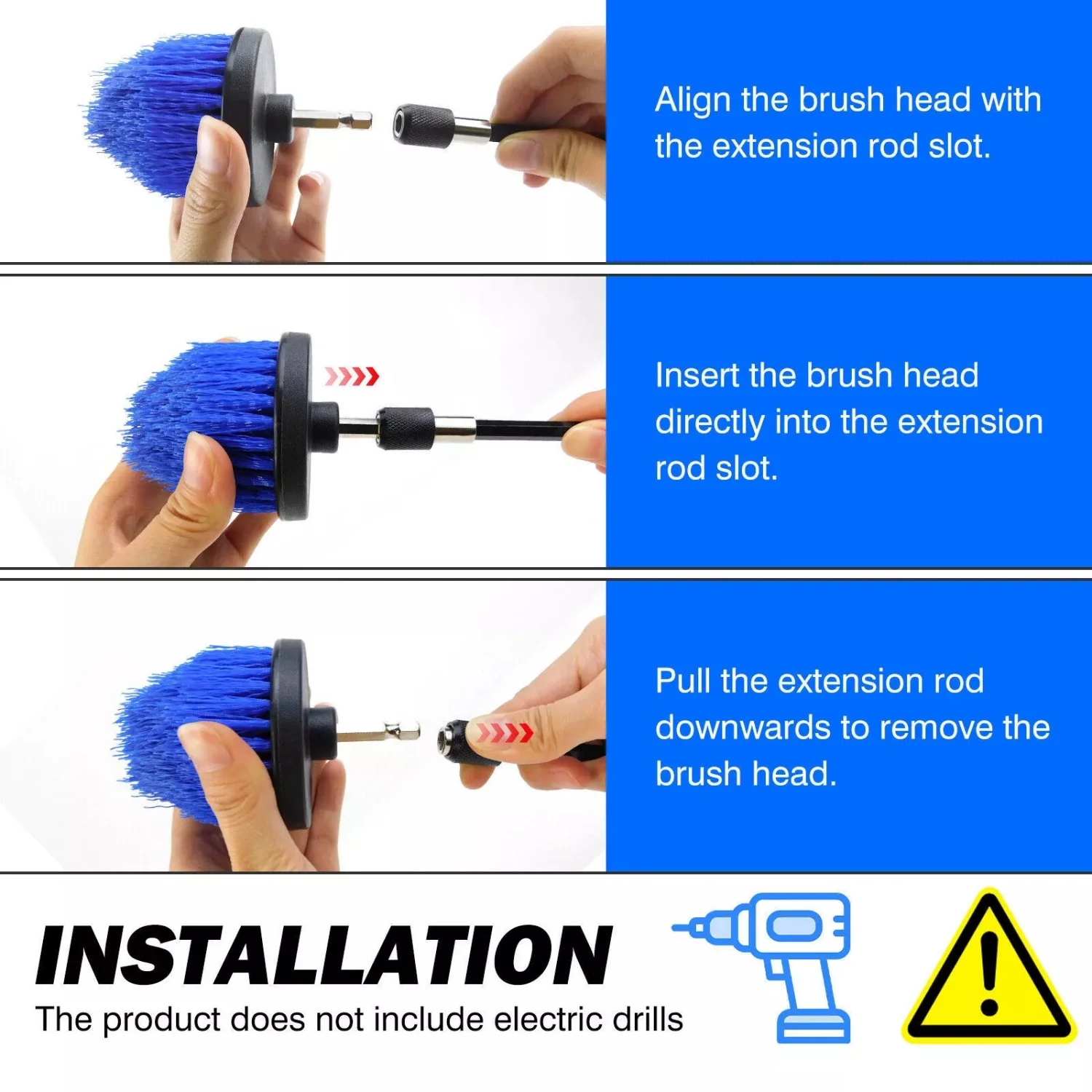 5 DIFFERENT BRUSHES: Includes 3 flat brushes (2‘ / 4’ / 5‘), 1 round brush (3’), 1 angled brush (2.5‘), and 1 extension pole (6’). Each power scrubber drill brush is carefully designed and durably constructed for indoor and outdoor use.