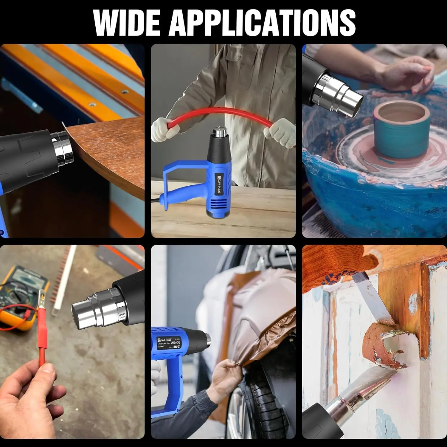 2.[Ergonomic Design]Lightweight heat gun and scientifically ergonomically designed handle prevents repetitive strain injuries and other musculoskeletal disorders for shrink-wrapping, crafting, embossing heat, paint stripping, roofing, wire stripping, automotive glass tinting, soldering/desoldering, plastic welding, PVC pipe bending, loosening of jammed bolts and nuts, replacing ceramic tiles, softening of plastics and more.