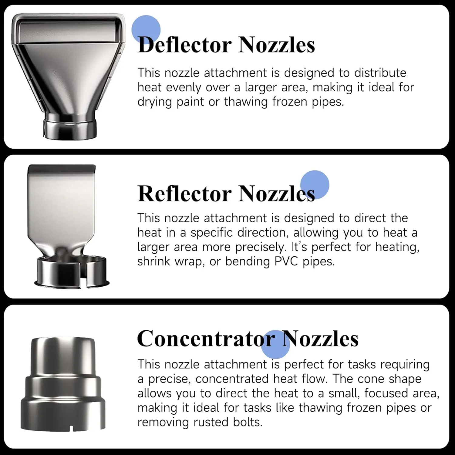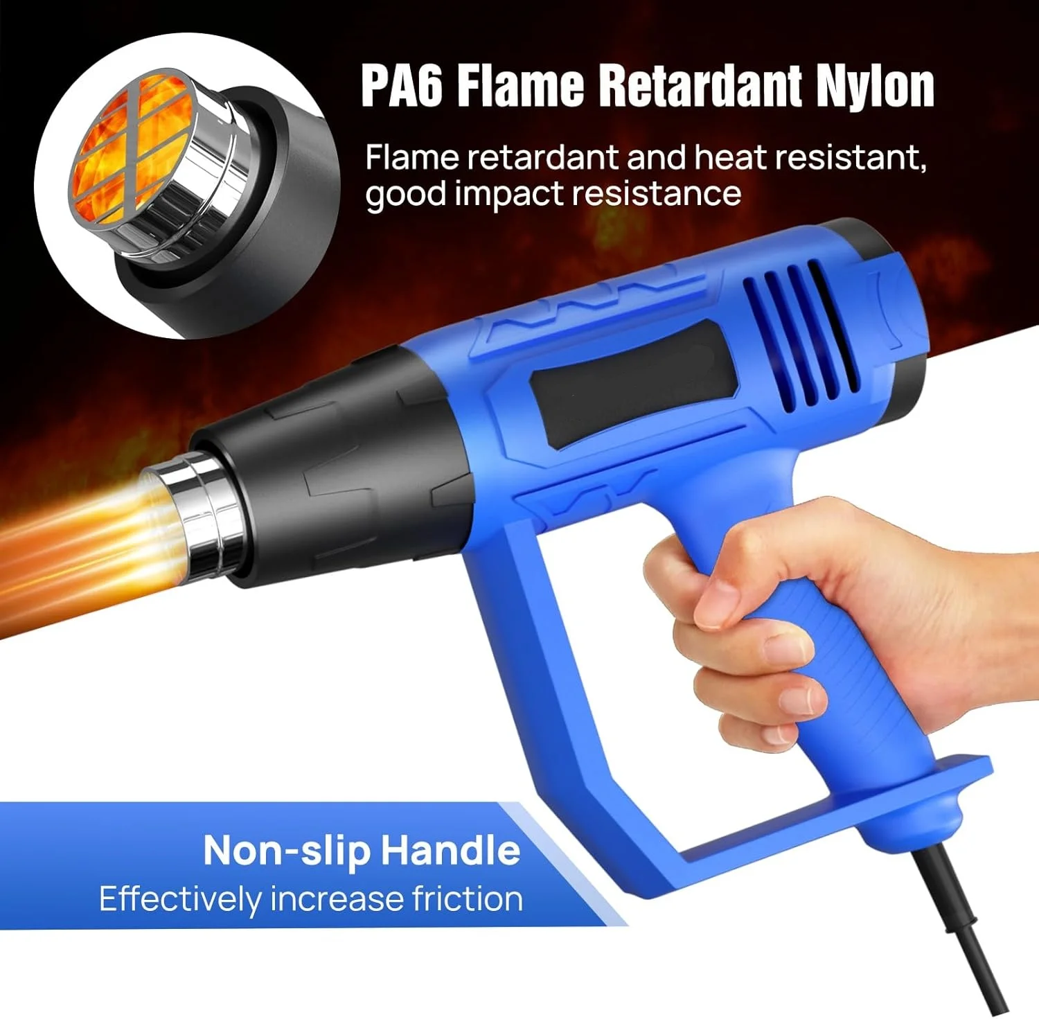 3.[3 Nozzle Accessories and Safety Design] The deflector nozzle directs a long, narrow heat pattern to the work surface; the concentrator nozzle directs a concentrated stream of heat to the work surface; and the reflector nozzle disperses the heat to flow evenly across the work surface. This heat gun also comes with an overload protector to avoid damage to your heat gun and ABS fireproof plastic and heat-resistant nylon for extra safety.