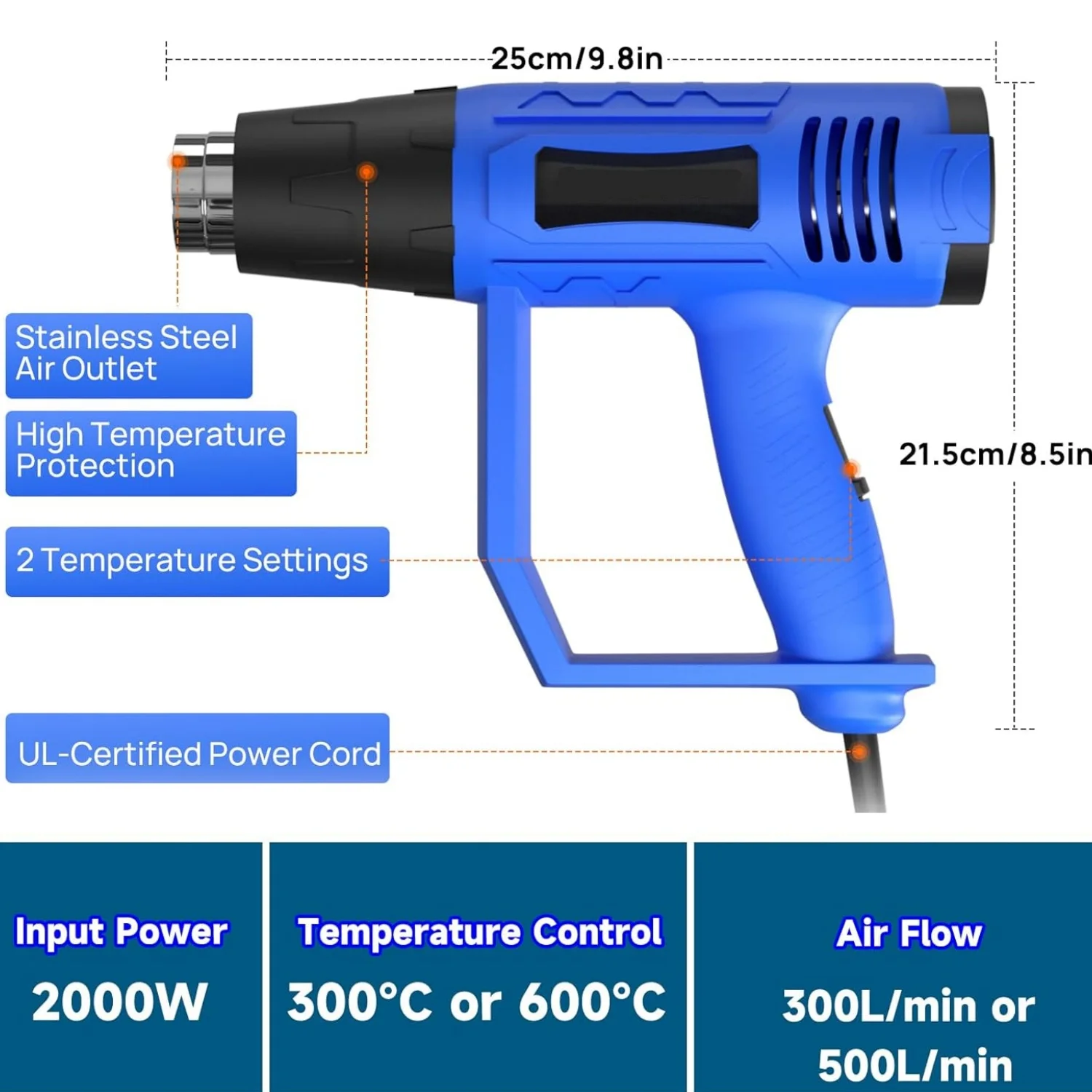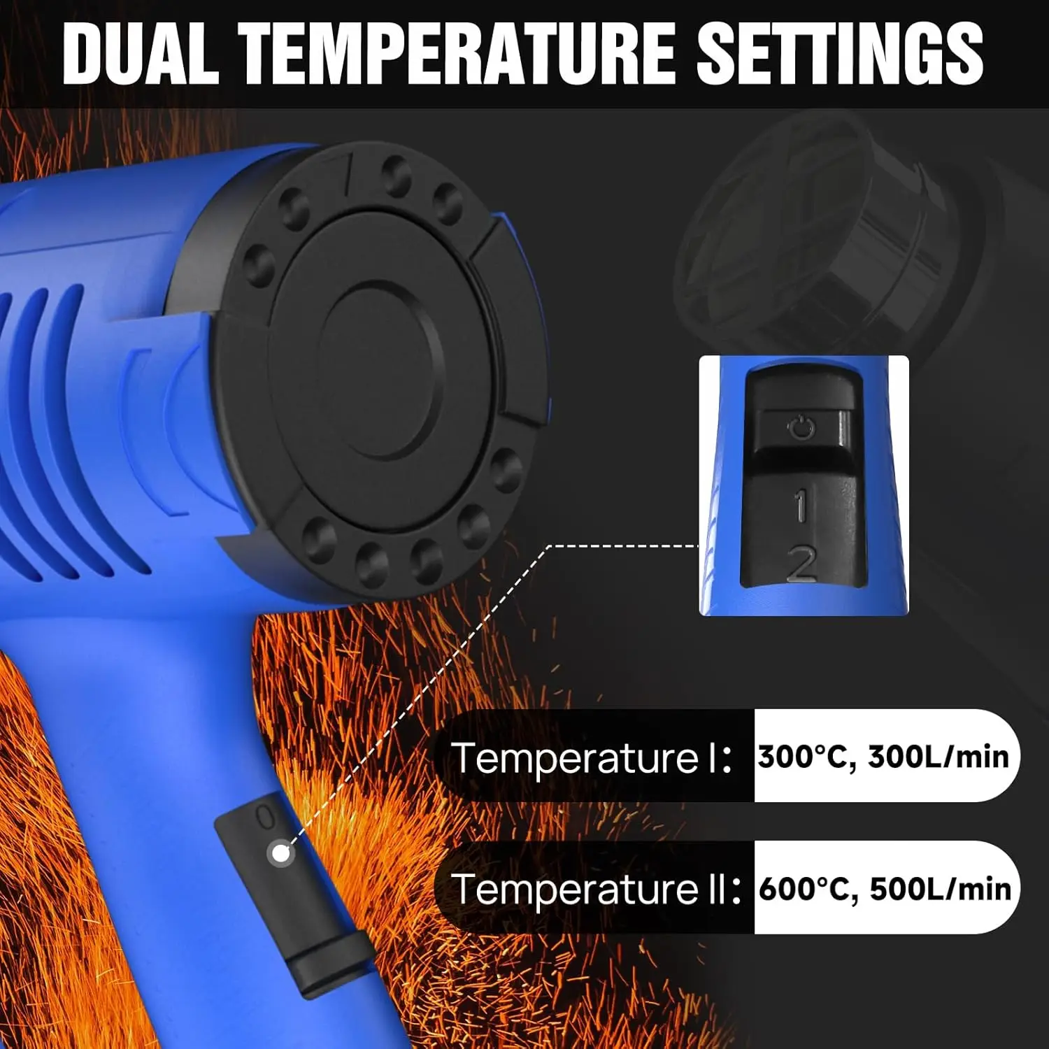 1.[POWERFUL POWER WITH 2 MODES] Our heat guns are equipped with a powerful 2000 watt motor that provides enough control and power for most tasks, so they are durable enough for even the most demanding professionals. Two mode switching with 2 temperature settings [ 1: 300 °C, airflow 300 L/Min; 2: 600 °C, airflow 5 00 L/Min]. Instant heat speed mode selection is located on the handle for quick changes during use, giving you greater control over the task at hand.