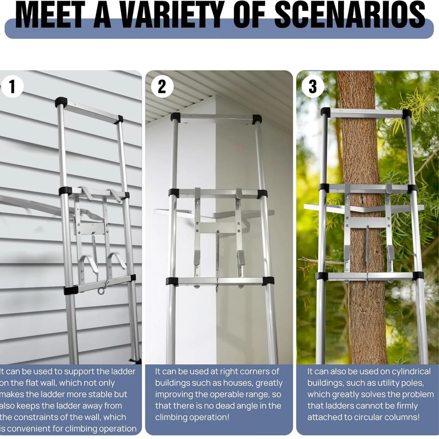 NOTE: Not fit for ladder of step space in 40cm or higher. Specially designed to fit the corner points, column, trees, telegraph poles drainpipes whilst for more elbow room to work.