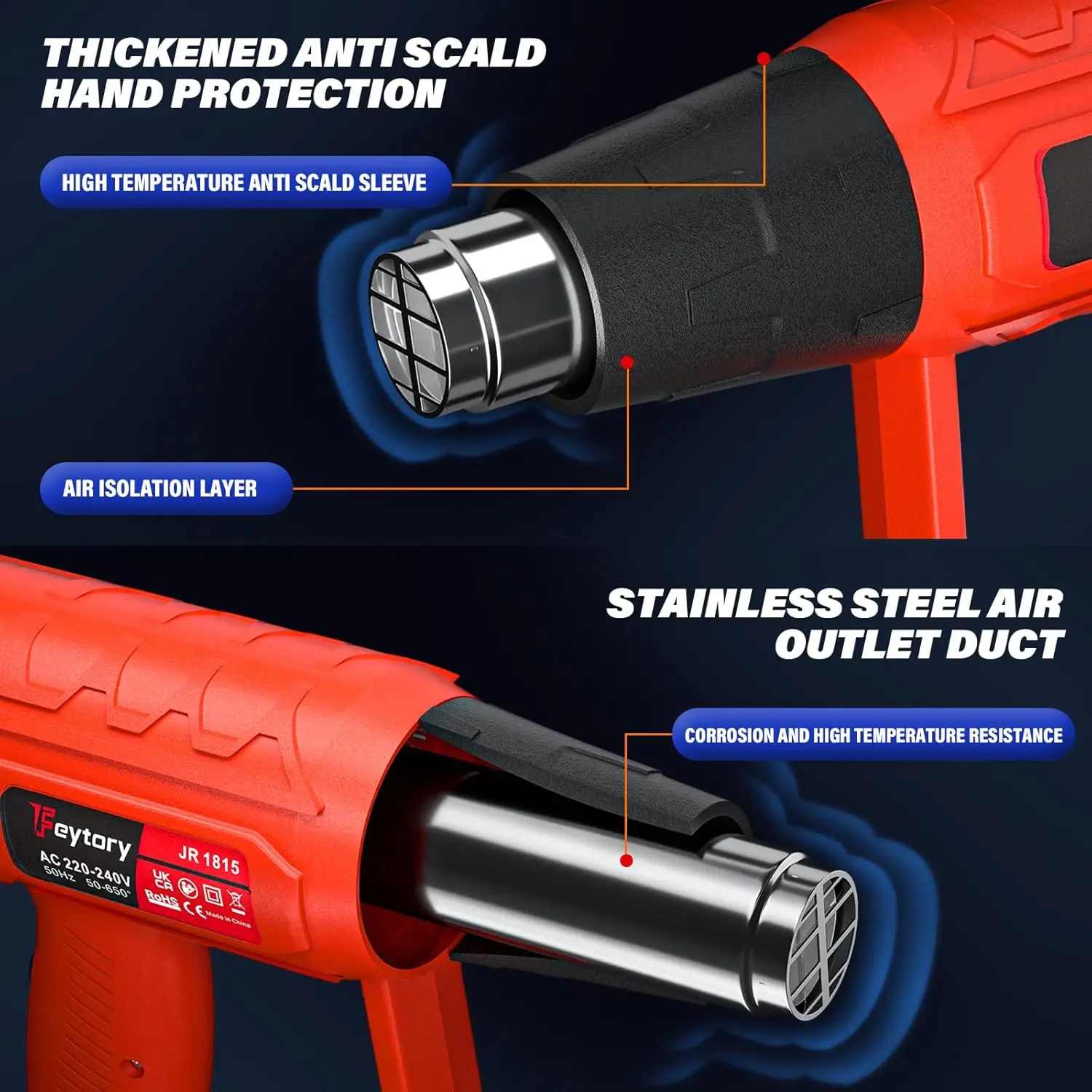 ▶ [Durable Service Life] The components of this heat gun are durable and encapsulated in a high durability housing. The oxidised heating wire, fan and mica plate are all made of high temperature resistant materials and coupled with an all-copper motor to support a product life of up to 800 hours.