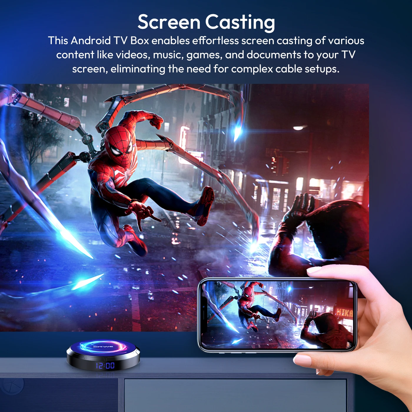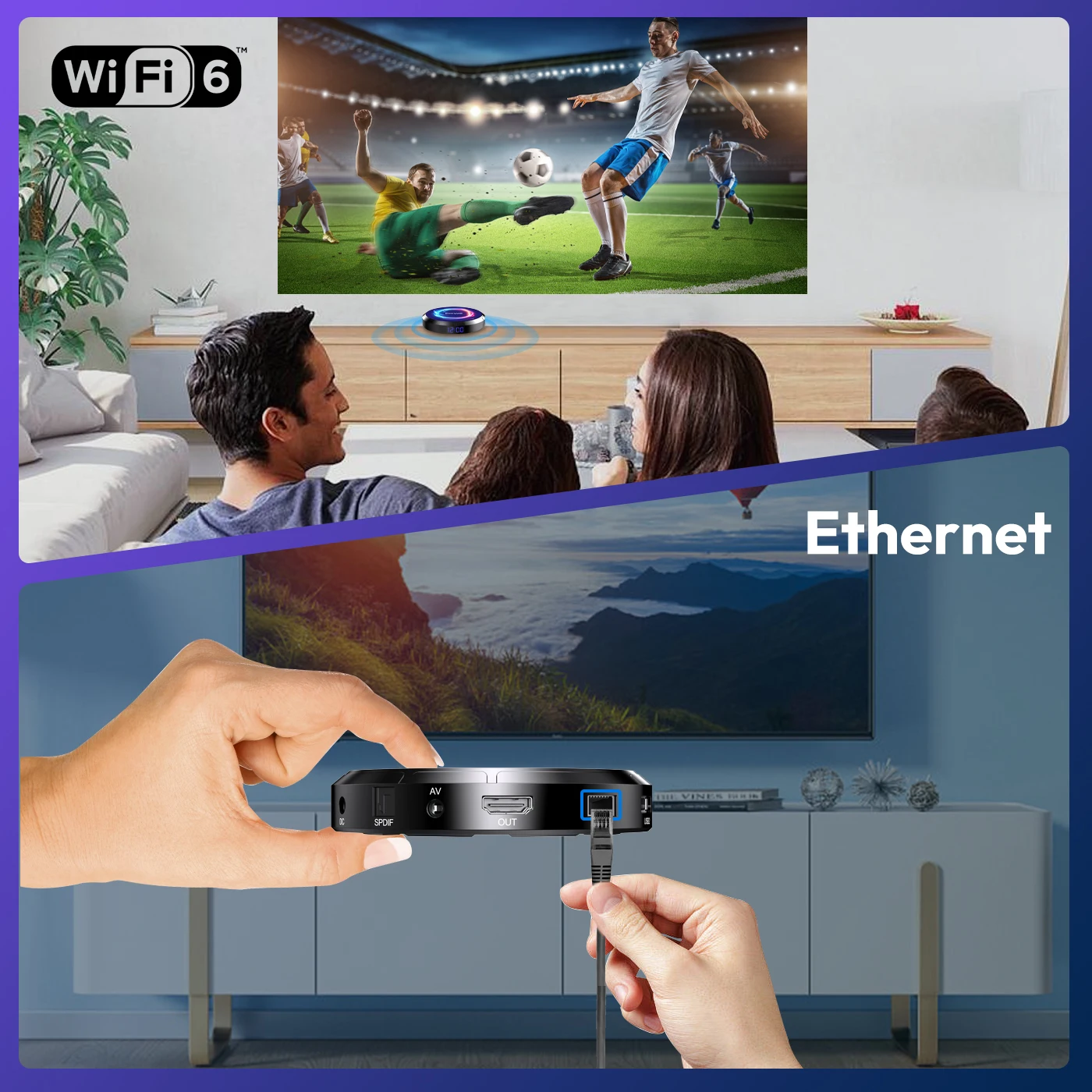 The Smart TV Box offers a rapid and reliable 5G WiFi 6 connection, which can achieve transmission rates as high as 9.6 Gbit/s. Thanks to the advanced WiFi 6 technology, users are able to relish a swift and steady network environment, ensuring a smooth and uninterrupted experience during streaming, gaming, and other activities. Moreover, it comes with HDMI 2.0, 10/100M Ethernet LAN and Bluetooth 5.0, presenting a variety of connectivity alternatives and facilitating improved wireless audio transmission. With such outstanding features, it’s set to redefine your home entertainment experience.【more comfort and convenience.】