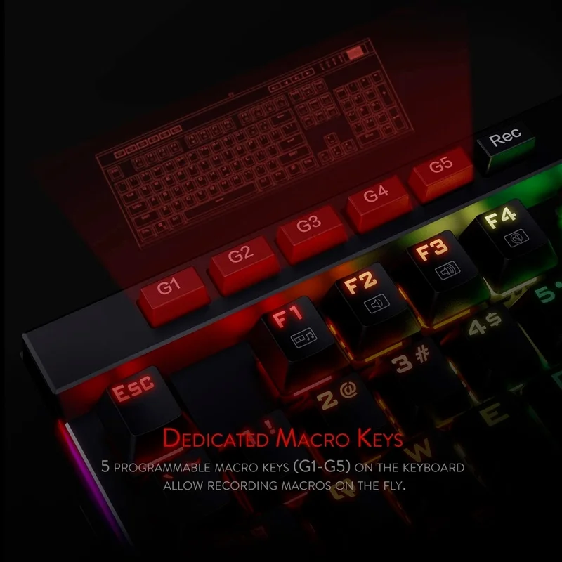 5 Macro Keys: There are 5 programmable macro keys(G1~G5) on the keyboard which can be recorded macros on the fly without any additional software required to be installed. Easy to edit and DIY your stylish keyboard.