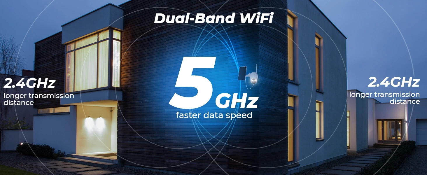 The video surveillance camera can work 100% wireless over 2.4GHz/5GHz dual-band WiFi, no cables or wiring hassles.