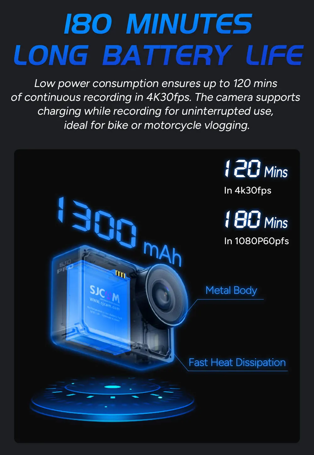 180 minutes long battery life:Low power consumption ensures up to 120 mins of continuous recording in 4K30fps. The camera supports charging while recording for uninterrupted use,ideal for bike or motorcycle vlogging.